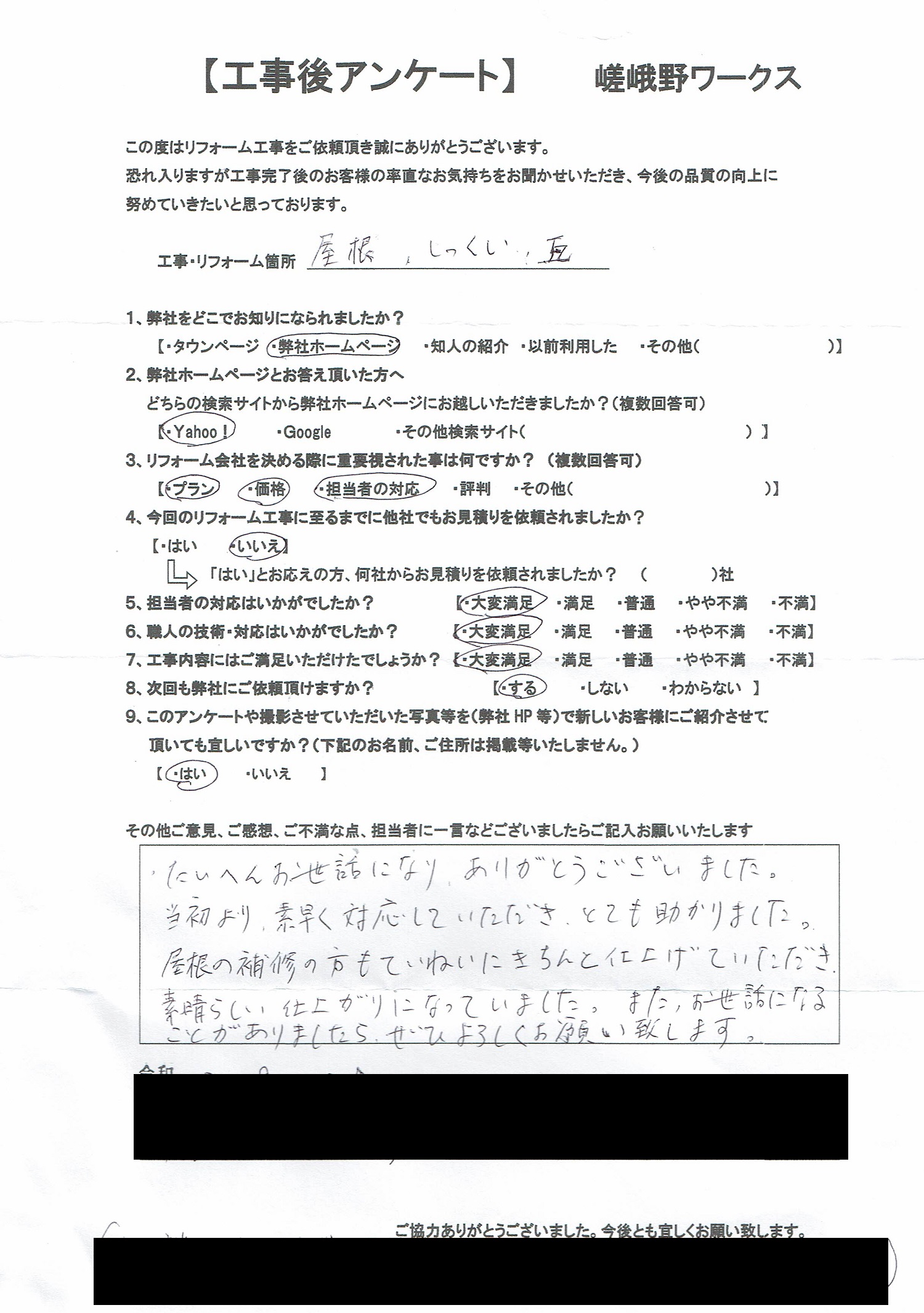 日本瓦屋根修繕工事 [のし瓦、しっくい修繕、谷樋交換]アンケート 2021-11-29 2025-05-12 大変お世話になりありがとうございました。当初より素早く対応していただき、とても助かりました。 屋根の補修の方もていねいにきちんと仕上げていただき、素晴らしい仕上がりになっていました。 またお世話になることがありましたらぜひよろしくお願い致します。 ←アンケートを拡大するには画像をクリック。