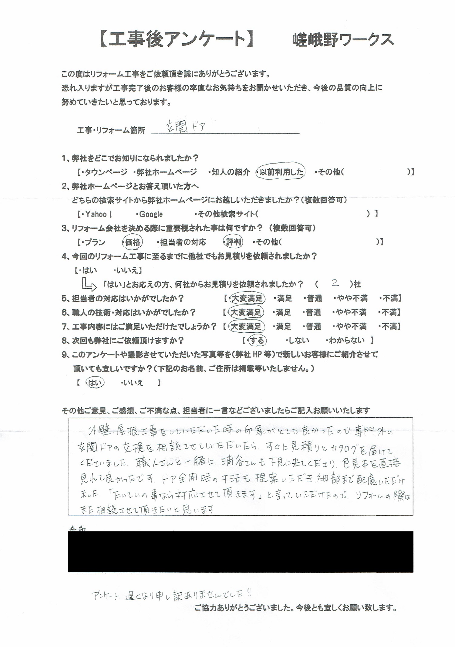 玄関ドアリフォーム カバー工法 アンケート 2021-09-07 2025-05-12 外壁、屋根工事をしていただいた時の印象がとても良かったので専門外の玄関ドアの交換を相談させていただいたら、すぐに見積とカタログを届けてくださいました。 職人さんと一緒に浦谷さんも下見に来てくださり色見本を直接見れて良かったです。 ドア全開時の寸法も提案いただき細部まで配慮いただけました。 「たいていの事なら対応させていただきます。」と言っていただけたので、リフォームの際はまた相談させて頂きたいと思います。 ←アンケートを拡大するには画像をクリック。