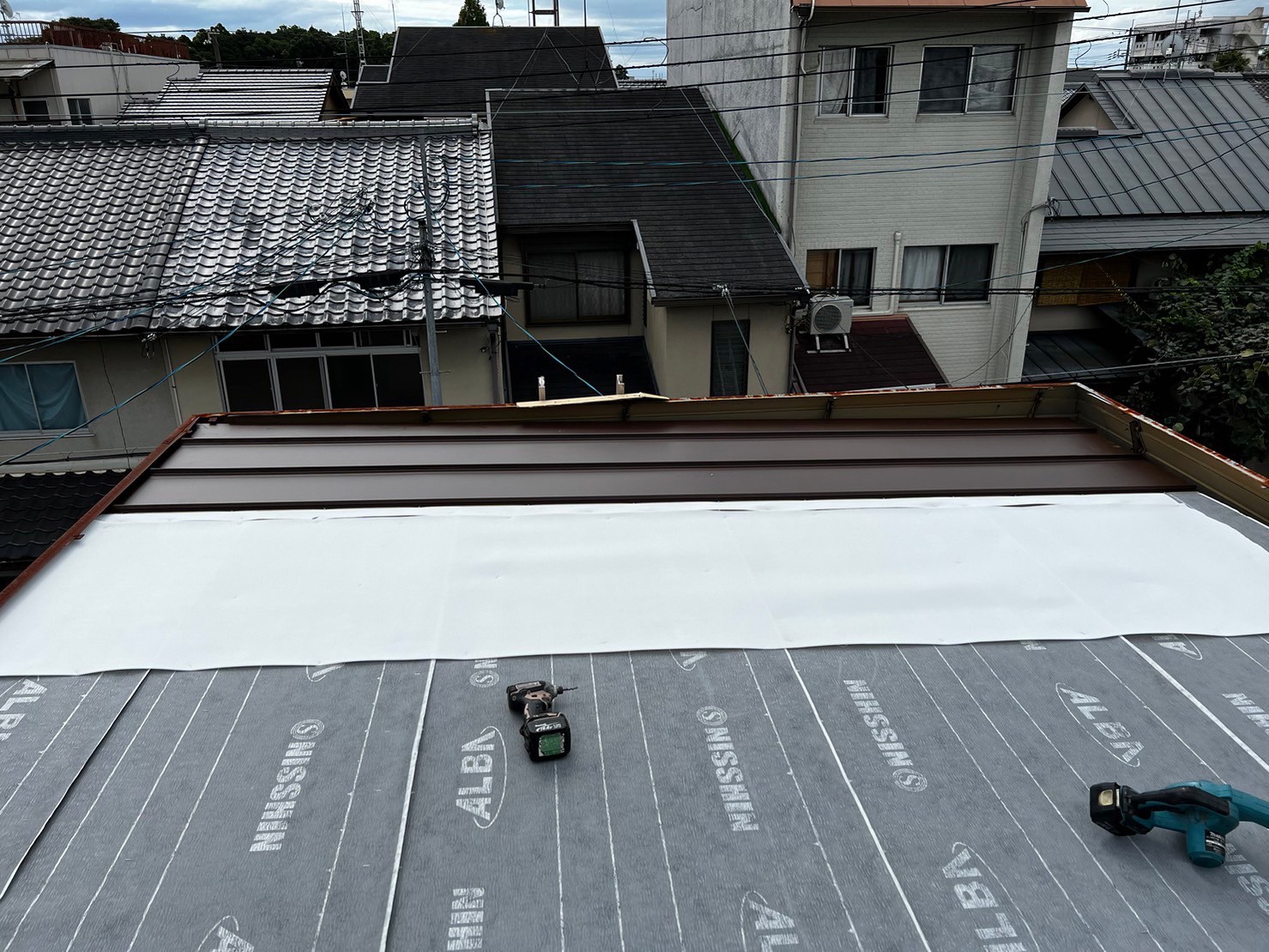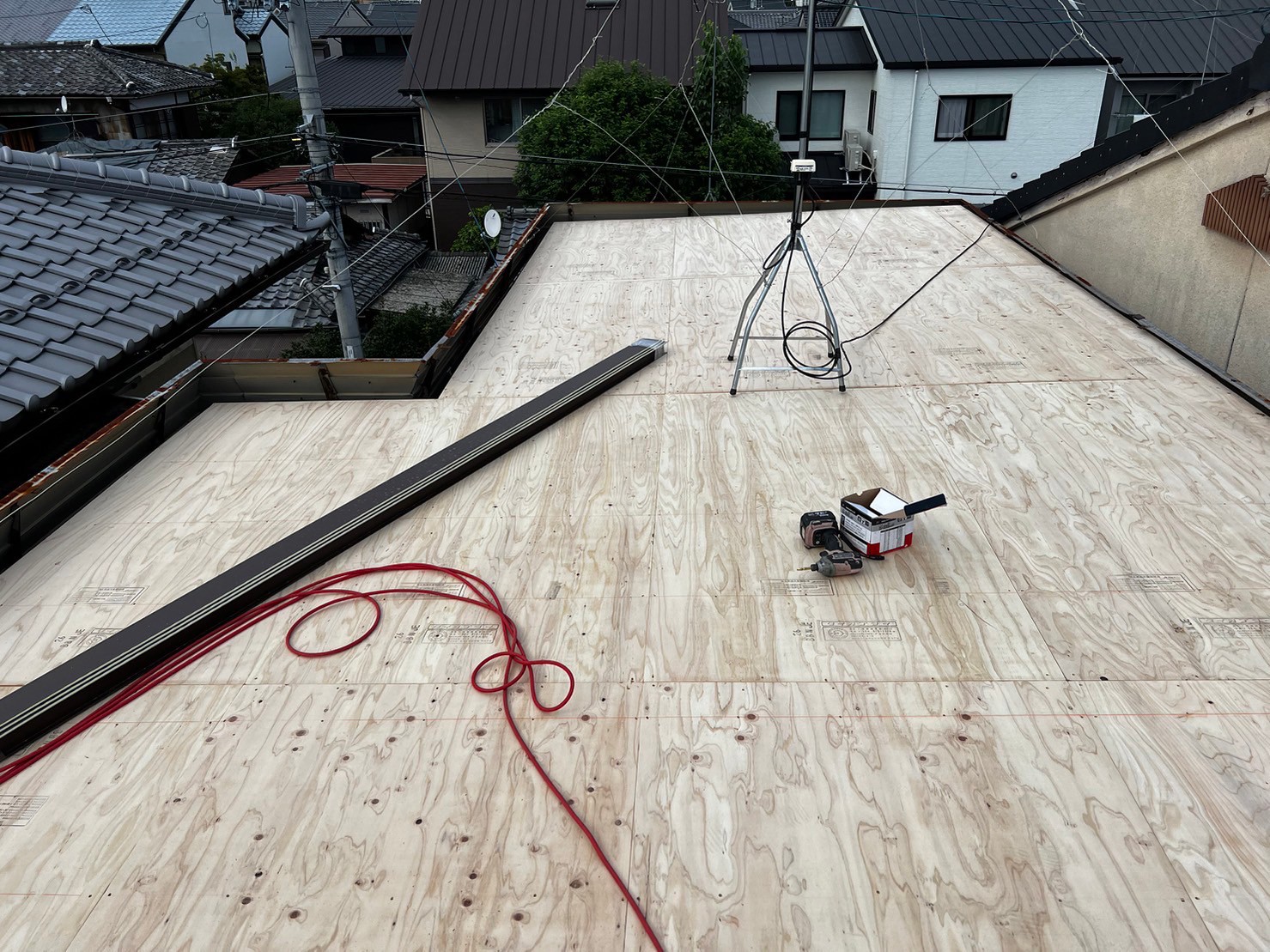 既存屋根を撤去し12mmの構造用合板を増張りし下葺材のゴムアスルーフィングを敷設します。