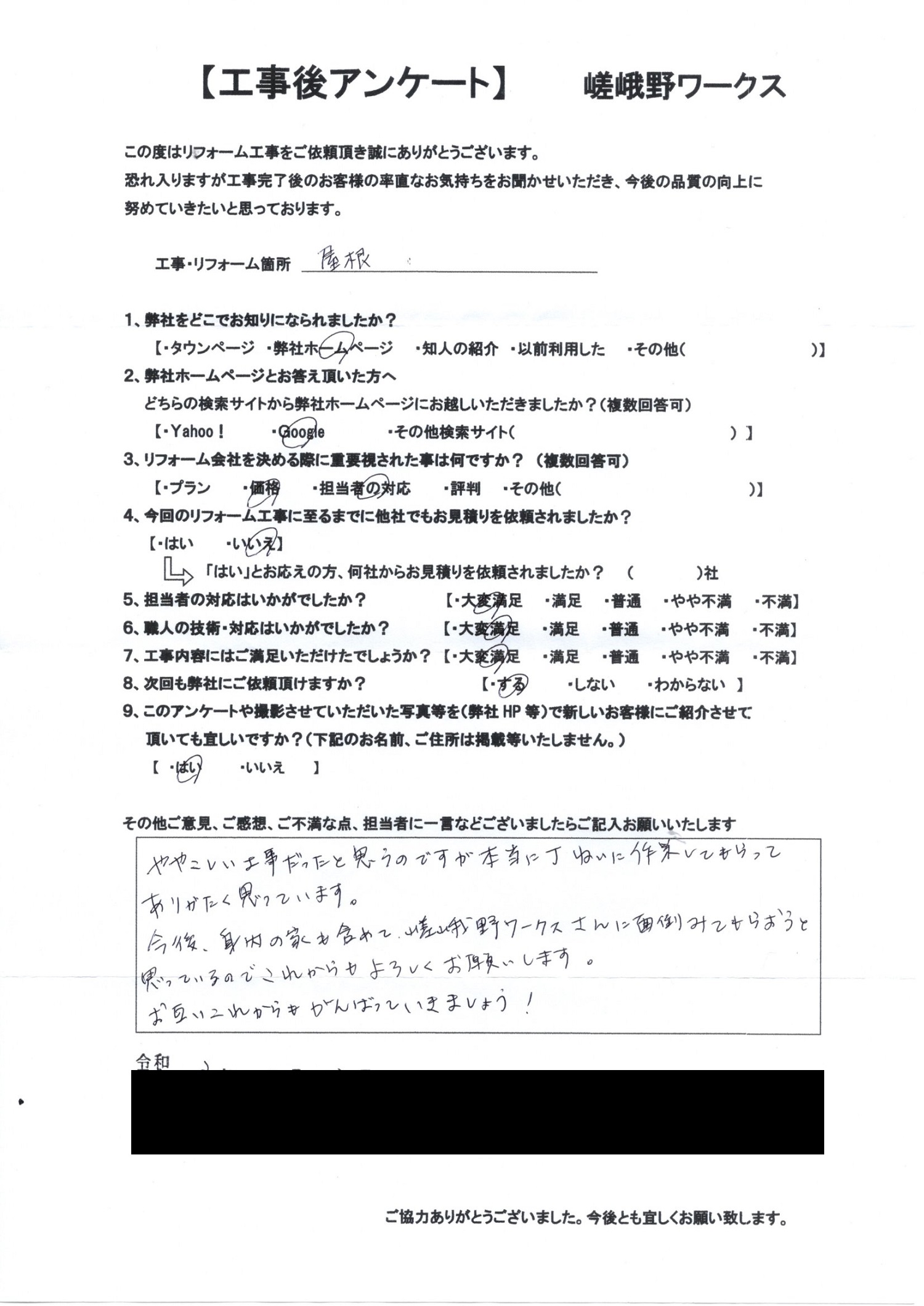 屋根葺き替え工事 ガルテクト&立平葺 アンケート 2022-02-07 2025-05-12 ややこしい工事だったと思うのですが本当に丁寧に作業してもらってありがたく思っています。 今後、身内の家も含めて嵯峨野ワークスさんに面倒みてもらおうと思っているのでこれからもよろしくお願いいたします。 お互いこれからもがんばっていきましょう! ←アンケートを拡大するには画像をクリック。
