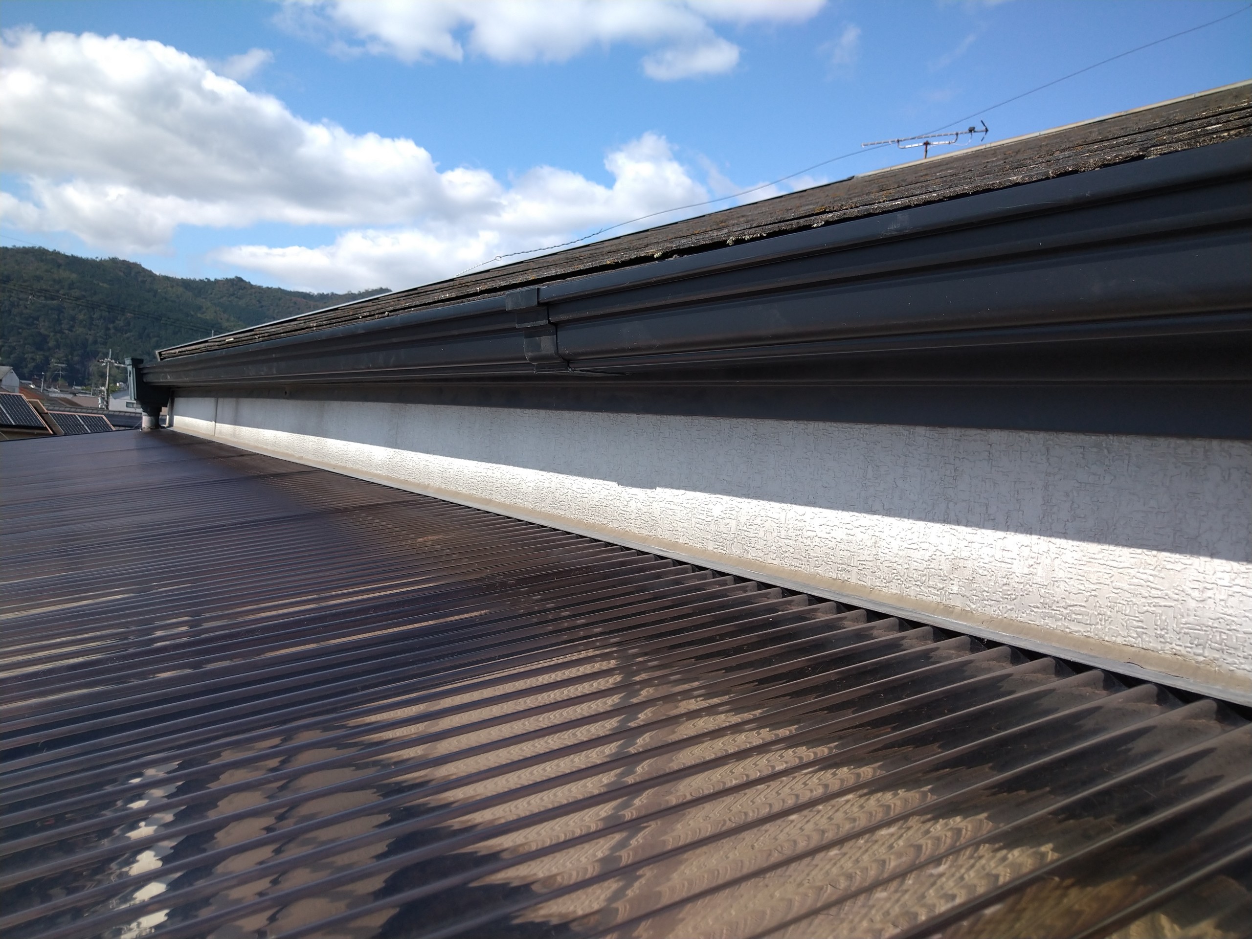 大屋根の雨といが垂れ下がったことが原因でした。詳しくみてみると雨といの金具が外れており、しっかりと木下地に固定されていませんでした。