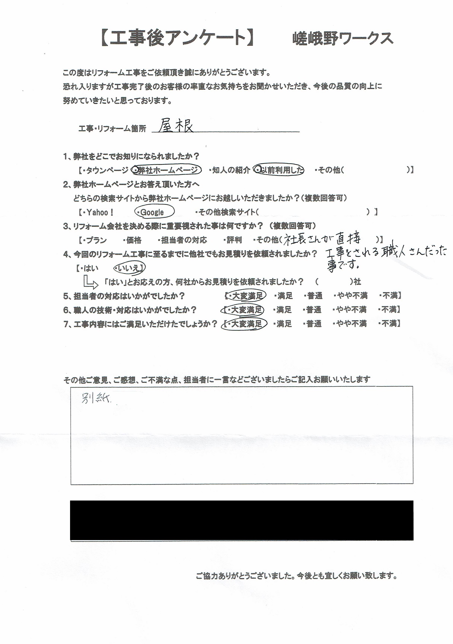 今回も屋根の状況を詳しくご説明いただき、修繕方法や使用する材料についていろいろなオプションをご提示していただきながら説明いただきましたので、納得して資材等選ぶことができました。
