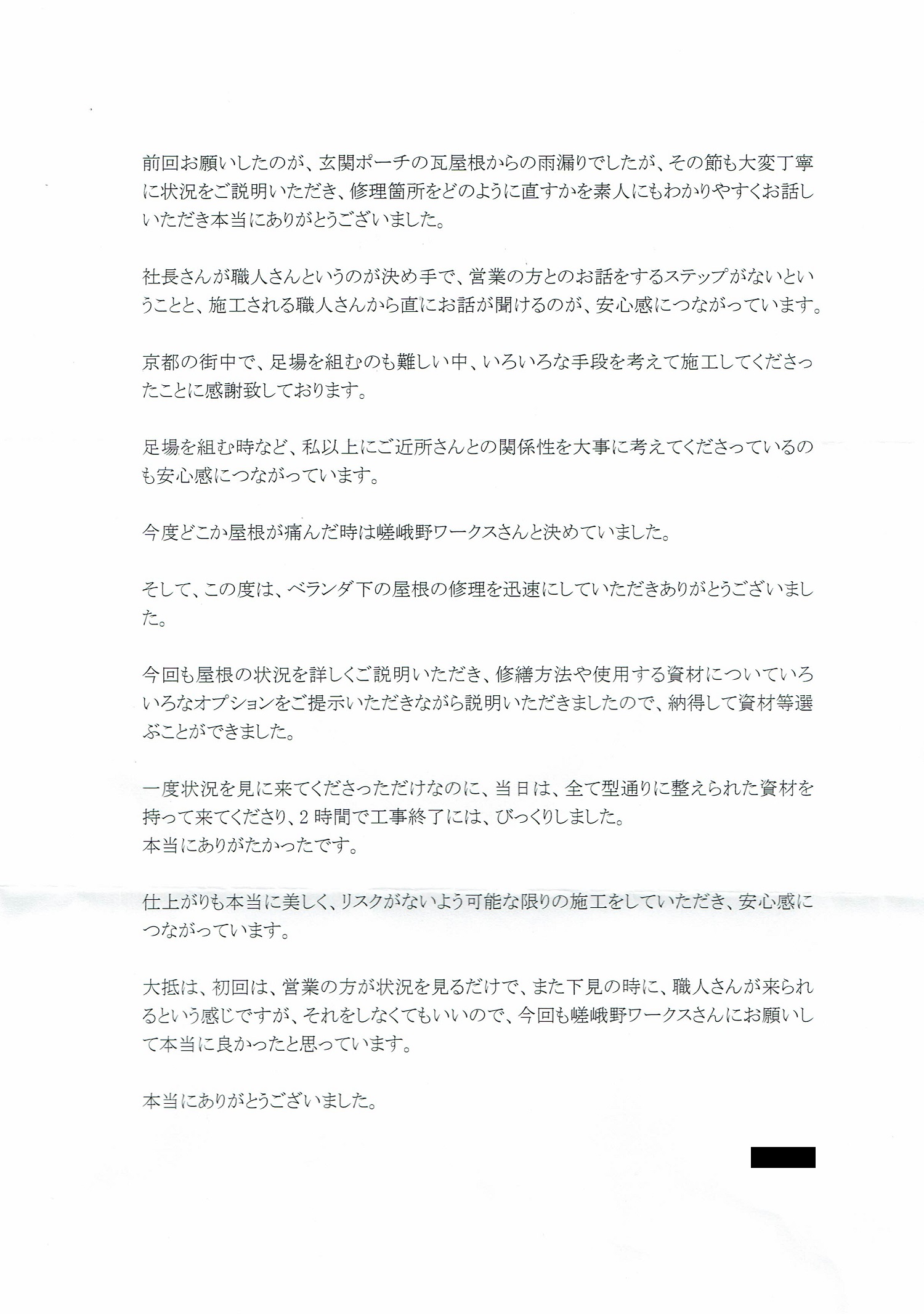 今度どこか屋根が傷んだ時は嵯峨野ワークスさんと決めていました。