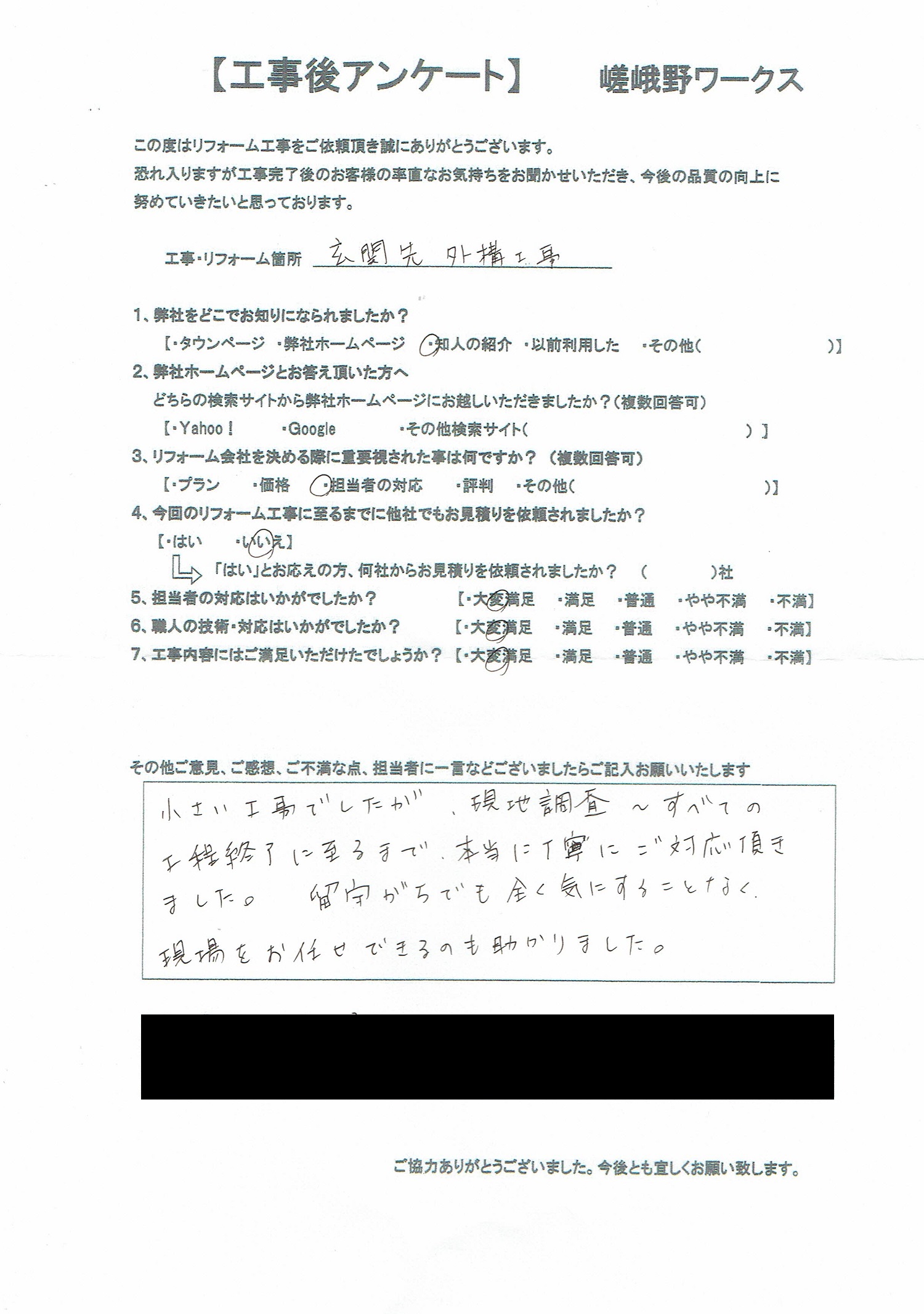 【エクステリア工事 】玄関 外構リフォーム/京都市東山区 アンケート 2025-03-28 2025-05-12 ←アンケートを拡大するには画像をクリック。 小さい工事でしたが、現地調査~すべての工程終了に至るまで本当に丁寧にご対応頂きました。留守がちでも全く気にすることなく現場をお任せできるのも助かりました。 ”こちらのアンケートの施工例を見る”