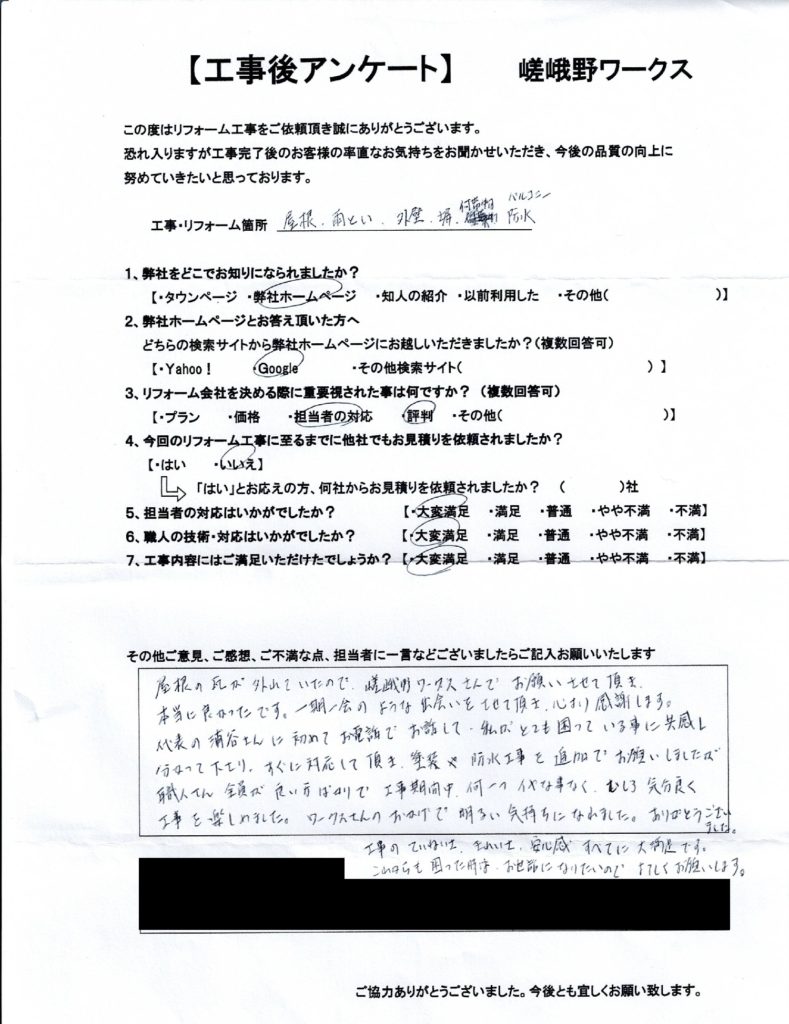 屋根の瓦が外れていたので嵯峨野ワークス酸でお願いさせて頂き本当に良かったです。一期一会のような出会いをさせて頂き、心より感謝します。