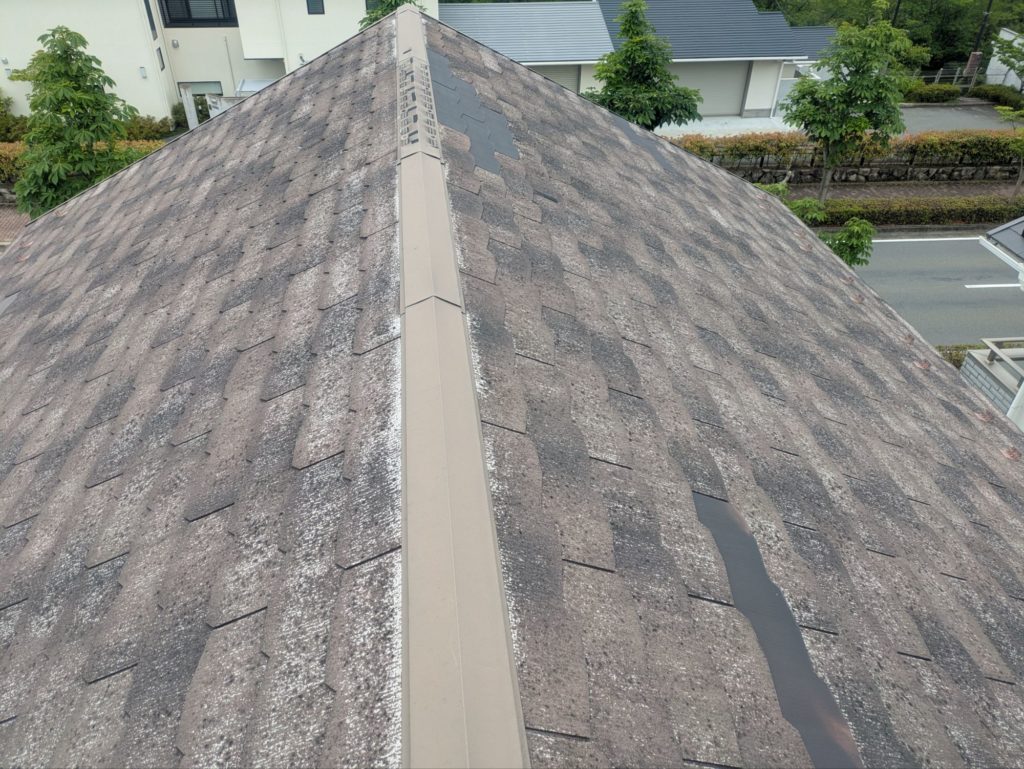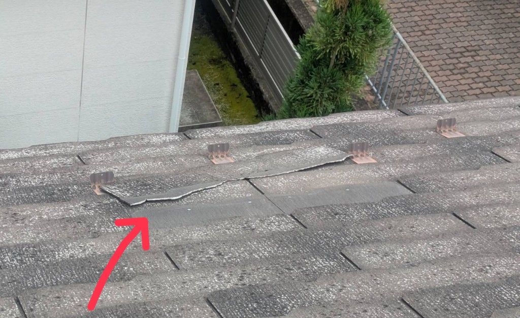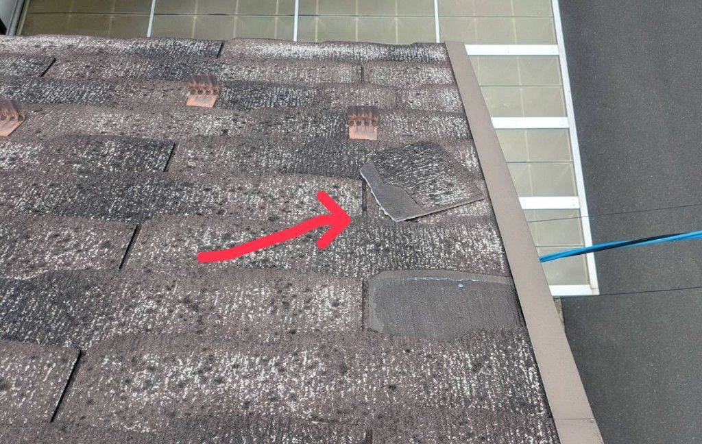 お客様のS様からお話を伺うと過去の台風でも屋根材が同じような状況になったことがあるそうで、屋根を見渡すと屋根材のカラーベストの差し変えが行ってあり、今後再び同じような症状が起こる可能性がある状態でした。